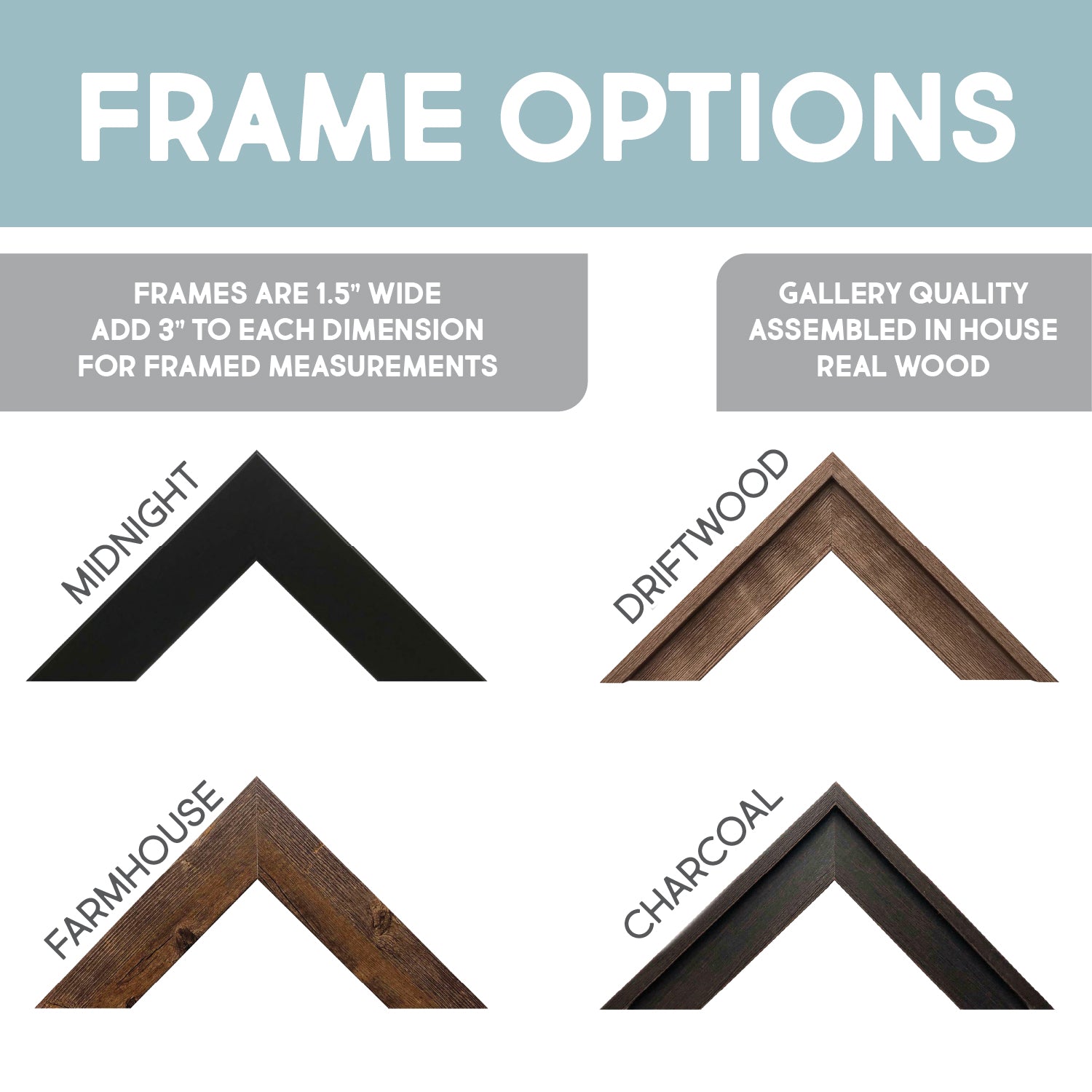 Your map is framed by hand in your choice of four premium frame options. Each frame is carefully selected to complement the natural wood tones of your map while providing a durable, heirloom-quality finish.